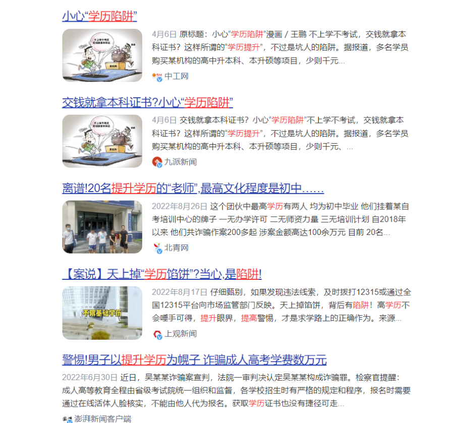 除了传统高考骗术外,近些年来,“成人学历提升”也逐渐成为了骗子浑水摸鱼的灰色地带。