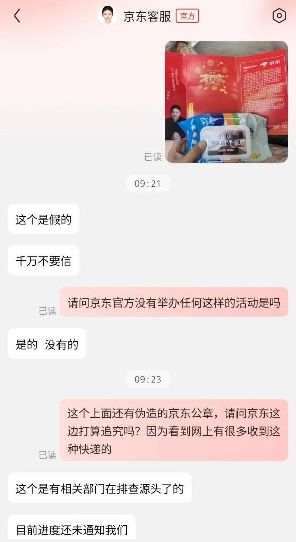 上午9时30分许,正观新闻记者联系了京东官方客服,客服称“这个是假的,京东并未举办类似活动,相关部门正在排查源头,目前进度还未通知我们。”
