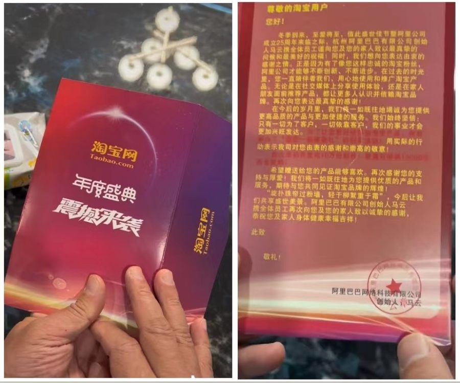 据博主“美丽风景塑造者”描述,自己在未购买任何商品的情况下收到该疑似诈骗快递,发货地为成都,打开后发现其中有一包廉价湿巾纸与一张卡片,上面写着“淘宝网 年度盛典 震撼来袭”,背面还写有一封信并印有“公章”。