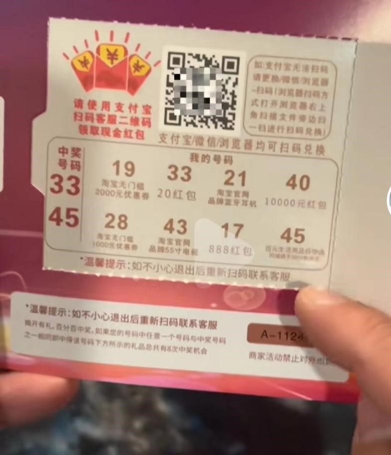 “卡片上还有一个伪装成开奖区的区域,打开后是20元左右红包或者百元以内的礼品,还有一个所谓的‘兑奖二维码’,诱导扫码前往浏览器打开。”该博主介绍。