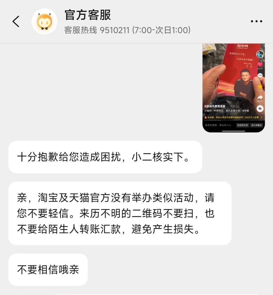 12月5日上午,正观新闻记者联系了淘宝官方客服,客服表示:“淘宝及天猫官方未举办类似活动,请勿轻信,请勿扫描来历不明的二维码,也不要给陌生人转账汇款,避免产生损失。”