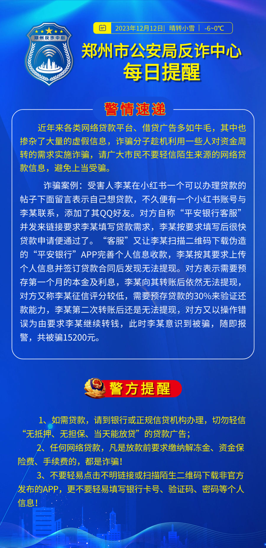 近年来各类网络贷款平台、借贷广告多如牛毛,其中也掺杂了大量的虚假信息,诈骗分子趁机利用一些人对资金周转的需求实施诈骗,请广大市民不要轻信陌生来源的网络贷款信息,避免上当受骗。