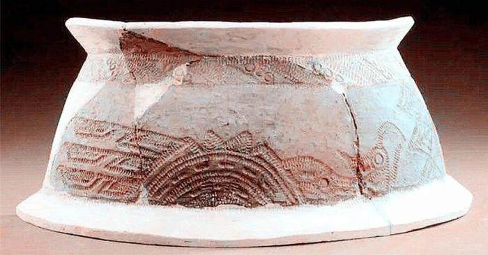 ▲白陶罐上的戳印鸟纹图案,出土于湖南洪江市高庙新石器时代遗址距今约7800年的地层中。