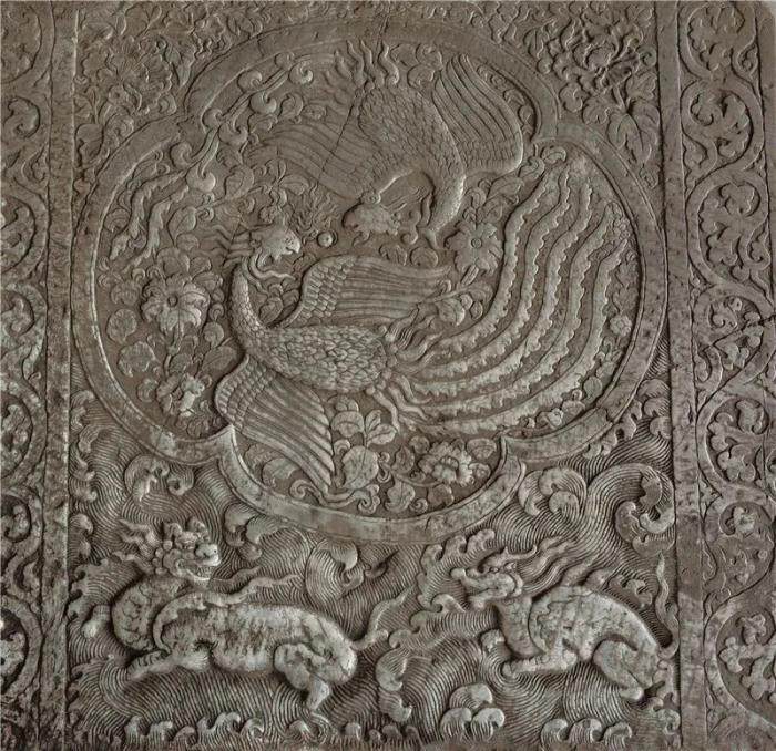 ▲元代双凤麒麟纹石雕,下方的凤头上有像灵芝一样的冠、缕束状的颈羽,以及五条浪草纹尾羽,上方的凤是卷草纹尾羽,呈现雄、雌双凤戏珠的样貌。现藏于中国国家博物馆。(图片来源:国家博物馆强国号)