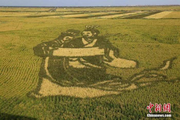 ▲稻田画《凤求凰》,位于辽宁盘锦红海滩国家风景廊道,以汉武帝时期的文学家司马相如追求卓文君的故事为主题,这里的凤与凰即雄雌配对的关系。刘宪国摄(图片来源: 中新网)