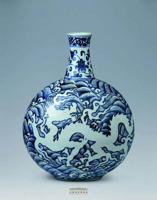 ▲明永乐青花海水云龙纹扁瓷瓶,瓶腹的两侧饰满青花海水,各有一条白龙,扬爪腾身,似出没于惊涛骇浪之中,其龙爪与鹰爪相似。现藏于中国国家博物馆。(图片来源:国家博物馆强国号)