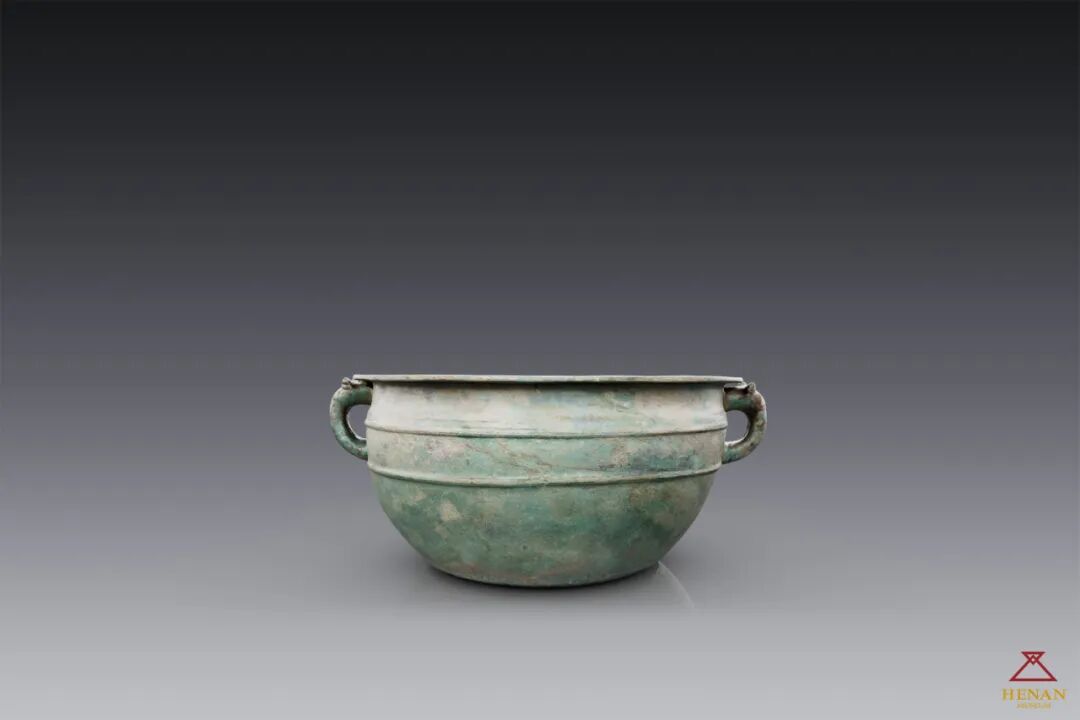 弦纹兽耳鉴,东周时期青铜水器,高19.4厘米,通耳宽44厘米。1997年在河南省新郑市郑韩故城发掘出土,河南博物院藏。