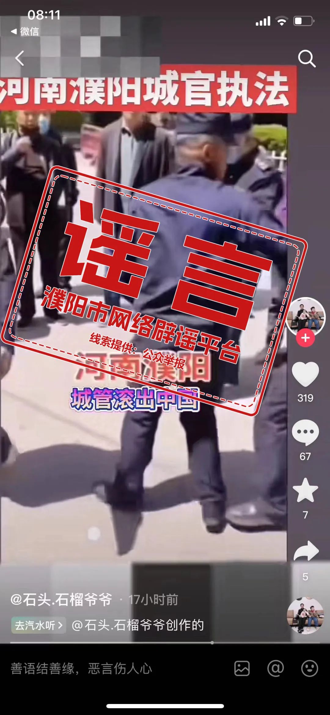 11月11日,短视频账号“石头·石榴爷爷”发布一条城管执法人员打人视频,并标注“河南濮阳城管执法”字样。经濮阳市网信部门向市城市管理执法支队核实查证,该视频中的执法人员并非濮阳市城市管理执法支队工作人员,网传信息为谣言。