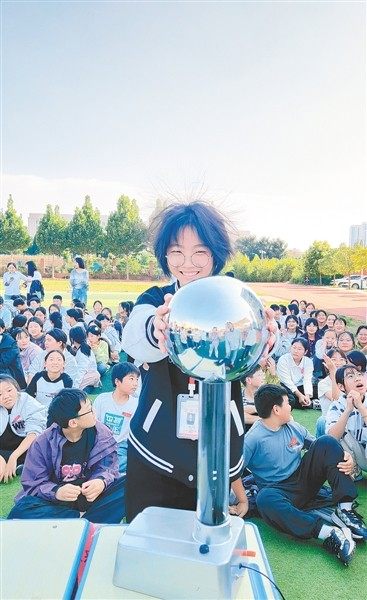 科学秀结束后,活动进入沉浸式体验环节。同学们分批次有序参与科普互动站点的闯关活动:“怒发冲冠”静电实验让头发竖立,生动展示电学现象;巨型泡泡体验使学生置身于表面张力的奇妙世界;音叉共振现象让人直观感受声波的传播规律;气爆纸杯阵挑战赛锻炼学生的动手能力;电碰迷宫游戏培养专注力和手眼协调能力。学生们在亲手操作和仔细观察中,不仅巩固了理论知识,更体验到科学探索的乐趣。