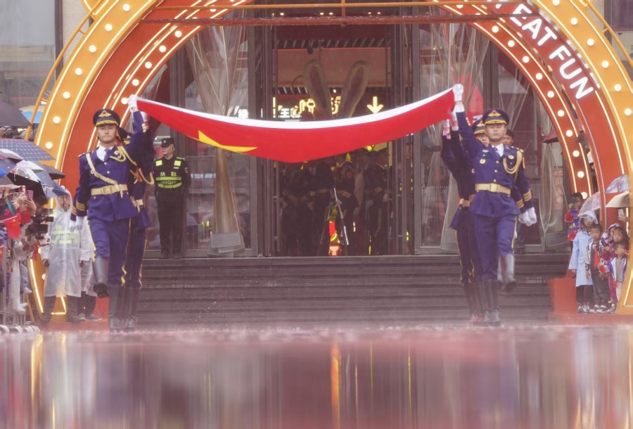上午9时许,升旗仪式正式开始。英姿飒爽的国旗护卫队迈着铿锵有力的步伐,护送五星红旗庄严入场。随着《义勇军进行曲》奏响,升旗手振臂一挥,鲜艳的国旗迎风舒展,在全场肃穆的目光中冉冉升起。细雨飘洒,那一抹红色愈显鲜艳夺目。