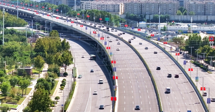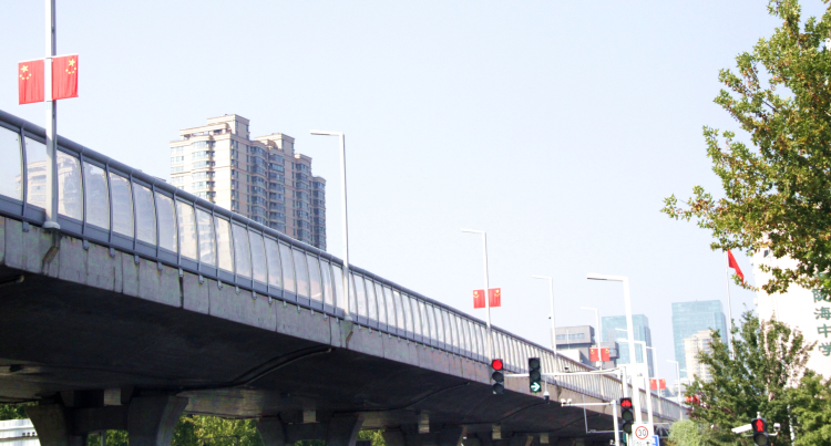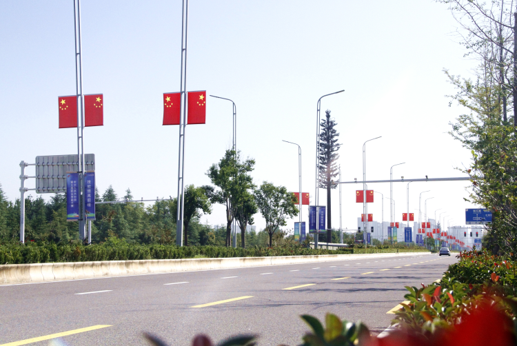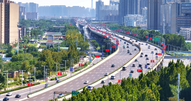 农业路快速路在一面面鲜艳的五星红旗点缀下分外美丽。