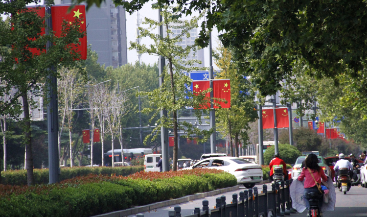 建设路上满城飘扬的国旗,是这个节日独一无二的“中国式浪漫”。