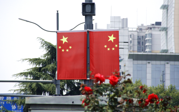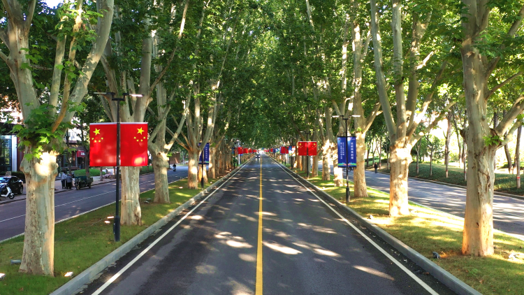 桐柏路上,车辆与行人在国旗下行进,强烈的仪式感和自豪感油然而生。