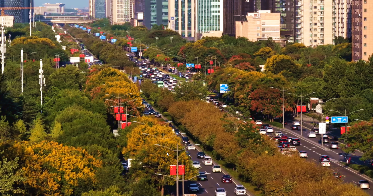 江山路上放眼望去,一片片“中国红”成为这个秋天最美的景致。