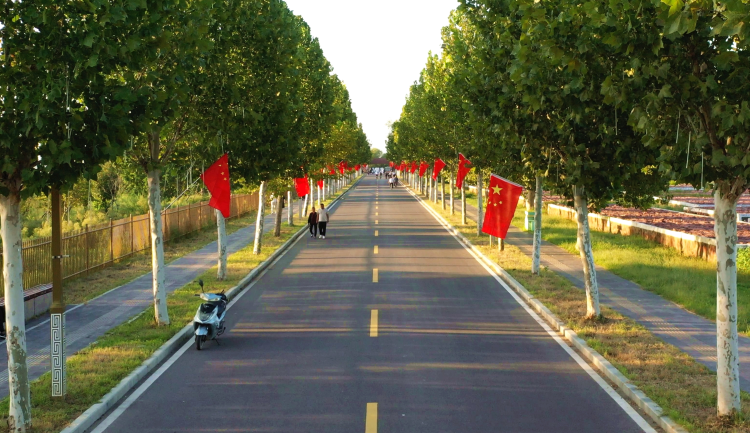 中原路上,整齐的国旗与两旁的绿植花卉相映成炬,铺就出一条充满生机与喜庆的红色长廊。
