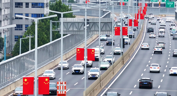 陇海快速路上,国旗均按规格、高度和角度统一悬挂,形成庄重美观的视觉效果。