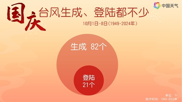 国庆假期有台风来袭其实并不算少见。盘点1949年至2024年台风大数据发现,历年国庆期间(10月1日至8日),共有82个台风生成,其中登陆我国的台风有21个,平均3至4年就有一个台风在国庆期间登陆。