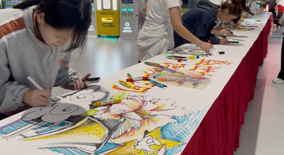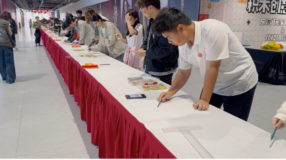 歌声未歇,另一幕震撼场景同步上演。来自河南经贸职业学院数字创意学院的76名学生,在一幅长达76米的画卷前凝神创作。他们以笔为媒,将对祖国的祝福倾注于色彩与线条之中:庄严肃穆的天安门城楼巍峨矗立,蜿蜒的万里长城如巨龙盘踞,遨游天际的航天飞船彰显大国实力,还有象征河南文化的龙门石窟、少林功夫等元素点缀其间。随着画笔不停舞动,一幅展现国家繁荣发展与地方文化特色的壮阔图景徐徐展开,将活动气氛推向高潮,现场掌声与欢呼声此起彼伏。