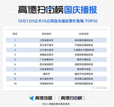 10月1日,2025年十一黄金周首日出行高峰如期而至。今日,高德扫街榜发布长假首日出行繁忙报告。其中,郑州新郑国际机场入选10月1日0点至10点国内周边交通最繁忙机场TOP10榜单。