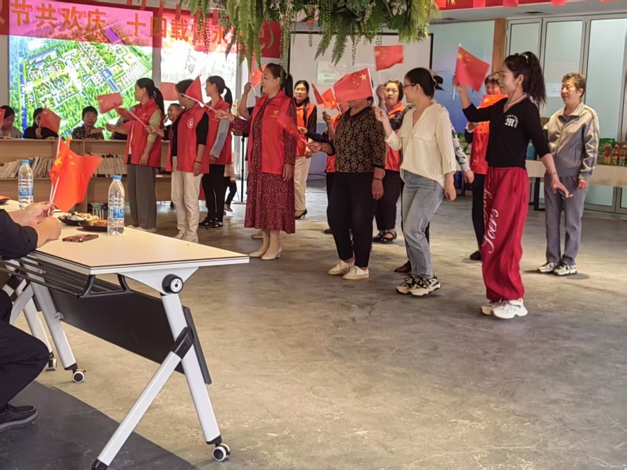 汇演过程中,还穿插了击鼓传花、原地律动游戏等互动环节,村民们积极参与,现场气氛热烈非凡。群演群唱的《军民大生产》和社区少年的诗朗诵《祝福祖国》,更是将活动推向了高潮。此外,还有“公鸡下蛋”、听口令选冠军等趣味游戏,让大家在欢声笑语中增进了邻里情谊。