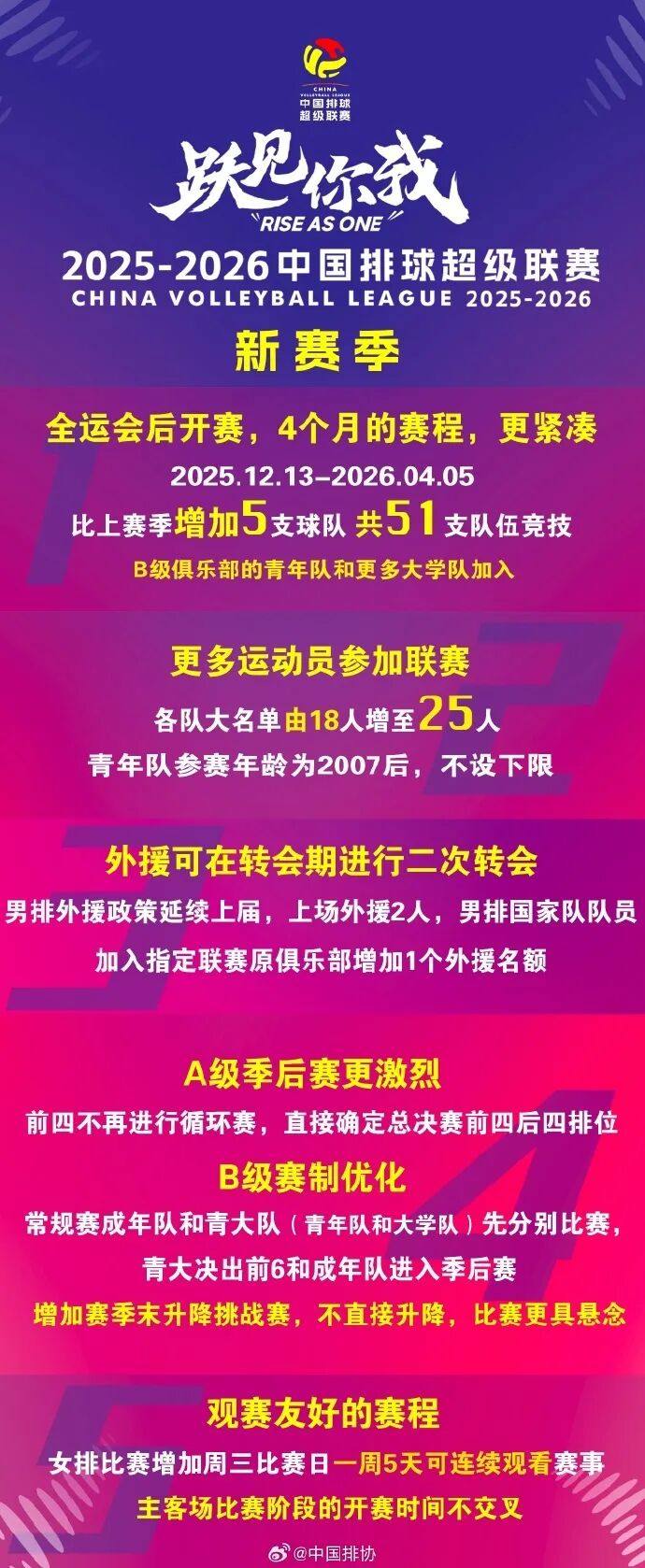 新赛季排超联赛将于2025年12月13日打响,至2026年4月5日结束。其中女排联赛时间为2025年12月13日至2026年4月1日,男排联赛时间为2025年12月14日至2026年4月5日。由于新赛季联赛将在十五运会后开赛,虽然赛程较上届缩短约半个月,但整体也更加紧凑。
