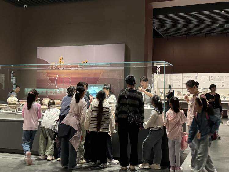 为满足游客深度探秘需求,博物馆推出的“免费讲解嘉年华”每日四场准时开讲。专业讲解员带领游客驻足文物前,从彩陶双连壶的纹饰寓意到环壕聚落的社会结构,全方位解读大河村遗址的文化内涵,让陈列的文物“活”起来。讲解结束后,不少游客仍围绕展品驻足思考,阴雨带来的出行不便,反倒让这份文化探索更显沉静深入。