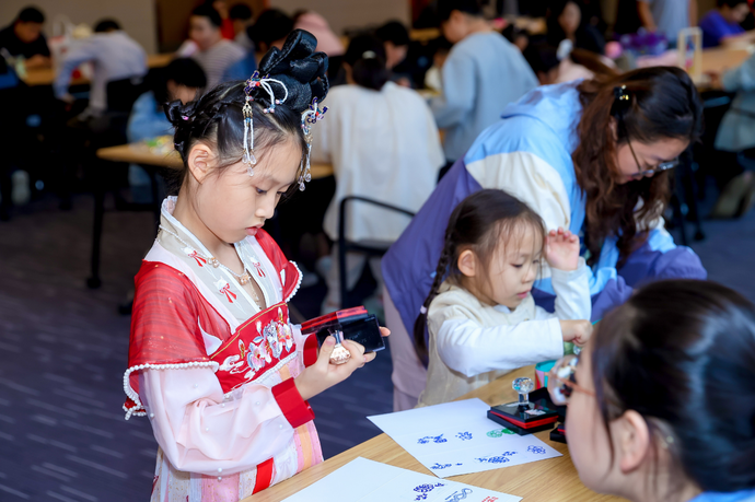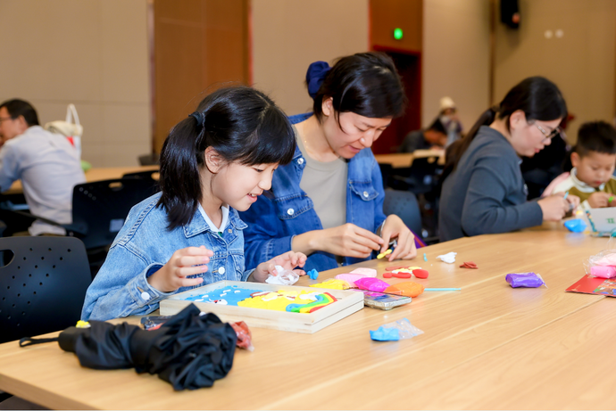 二楼报告厅内,粘土相框画活动同样人气爆棚。活动现场,9岁的小朋友波波在妈妈的帮助下,正用红色粘土仔细地制作国旗图案。“我们要把这个相框画放在家里最显眼的位置,”波波妈妈笑着说,“这是孩子献给祖国母亲最好的生日礼物。”