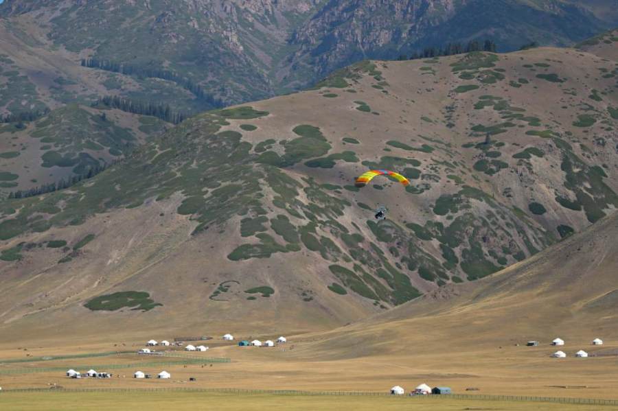 7月17日,游客在赛里木湖景区体验电动滑翔伞。 新华社记者 王婧嫱 摄