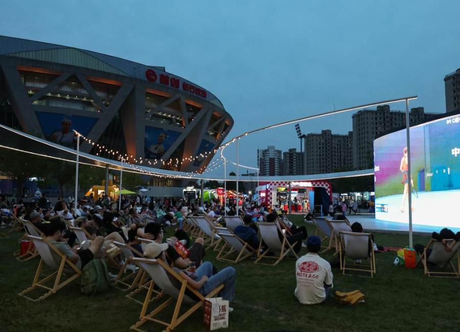 10月1日,游客在国家网球中心内的大屏前观看比赛。当日是国庆黄金周第一天,中国网球公开赛吸引不少球迷前来观赛,人们在观看高水平网球赛事的同时,也能体验网球相关娱乐活动,在假期尽享体育魅力。 新华社记者 杜昕怡 摄
