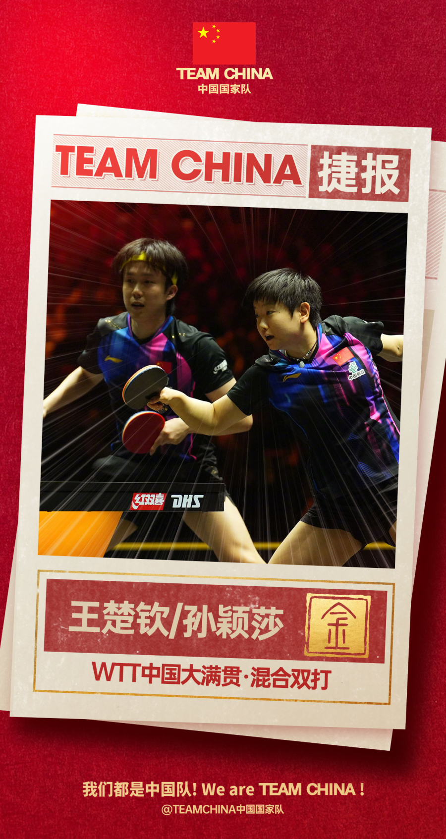WTT中国大满贯混双决赛,王楚钦/孙颖莎战胜队友黄友政/陈熠,获得WTT中国大满贯混双冠军。
