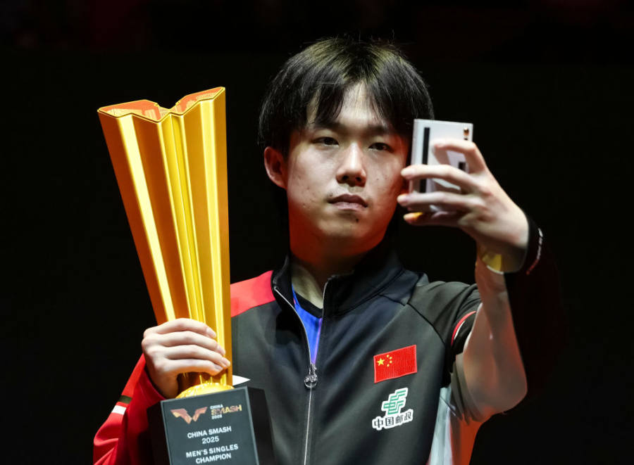 10月5日,冠军王楚钦在颁奖仪式上。当日,在北京举行的2025年世界乒乓球职业大联盟(WTT)中国大满贯赛男子单打决赛中,中国选手王楚钦4比0战胜法国选手费利克斯·勒布伦,夺得冠军。新华社记者 孙非 摄