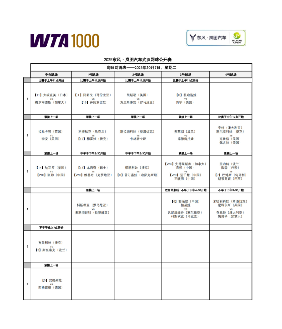 10月7日,2025东风·岚图汽车武汉网球公开赛继续进行。大牌云集,精彩纷呈。大满贯女单冠军斯瓦泰克、大坂直美、奥斯塔彭科、肯宁都将迎来今年武网首秀,中国金花张帅将亮相女单赛场再战纳瓦罗。