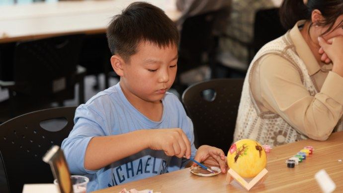 走进活动现场,白色的球形灯静静置于桌上。在工作人员的讲解下,参与者迫不及待地打开颜料包,开始创作起来。“昨天中秋节大家都在说赏月,今天想亲手做一个‘月亮’带回家。”一位带着女儿前来参与的母亲说。她身旁的小姑娘正专注地用黄色颜料涂抹月球底色,眼神里满是期待。