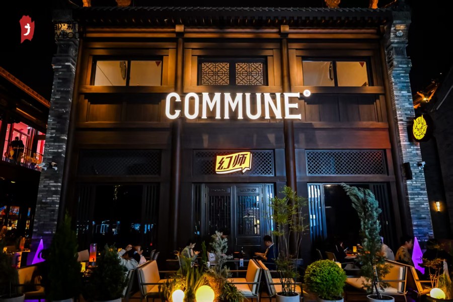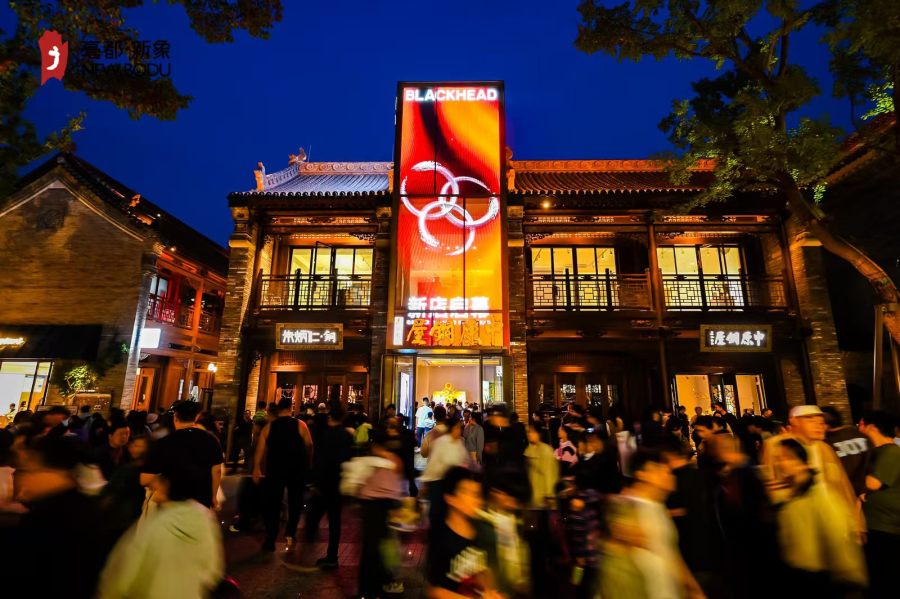 在这一框架下,品牌与建筑实现深度融合。如COMMUNE幻师以青灰色砖墙呼应商代肌理,檐角神兽造型融入现代灯光,营造出古今交织的视觉场景;麦陌则从青铜文明中提取元素,金色与木色的主调、墙面与立柱的浮雕细节,皆成为连接历史与日常的媒介。
