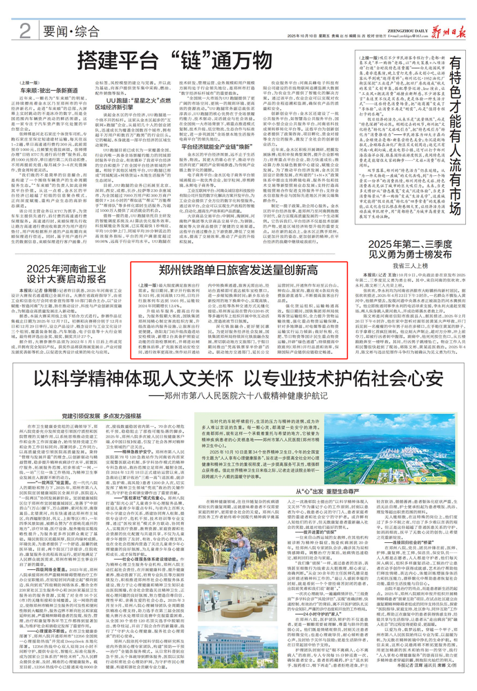 加大运力投放,助力便捷出行。针对假期亲子游、研学游、红色游、康养游、赏秋游等需求,国铁集团郑州局实行高峰运行图,在北京、上海、杭州、广州、深圳等热门方向和管内郑州、洛阳、南阳、濮阳、商丘等热门旅客城市间加大运力投放,采取加开临时旅客列车、动车组重联运行、增开夜间高铁列车和普速旅客列车加挂车厢等措施,最大限度满足旅客出行需求。假日期间,累计开行临客列车921列、夜间高铁173列,日均开行旅客列车达到1501列,运能较2024年同期增长12.4%。