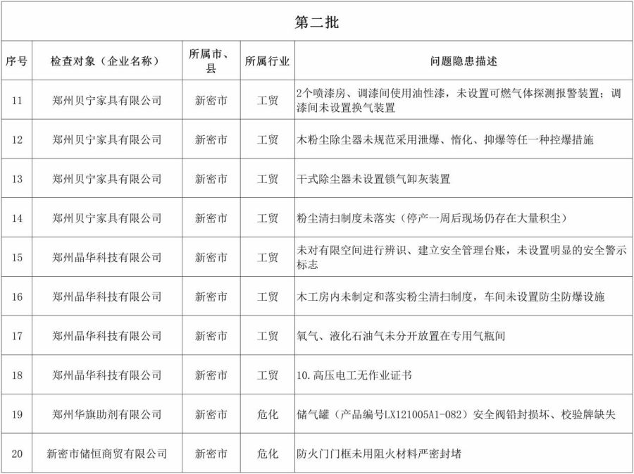 为扎实推进安全生产治本攻坚三年行动,压实企业安全生产主体责任,切实提高隐患排查整改质量,推动重大事故隐患动态清零,按照《河南省安全生产委员会关于开展全省第二轮安全生产明查暗访的通知》,2025年8月28日至9月9日,河南省安全生产明查暗访第一组对郑州市进行了明查暗访,现对明查暗访组发现的突出问题隐患予以集中曝光。各区县(市)、市直有关部门要高度重视,对问题隐患立行立改、依法查处,特别是对典型问题隐患要挂牌督办、追责问责、公开曝光、一案双罚;对问题隐患已整改到位的要持续跟进,防止问题反弹。要深入开展自查自纠,举一反三排查整治,彻底消除安全隐患,确保人民群众生命财产安全。