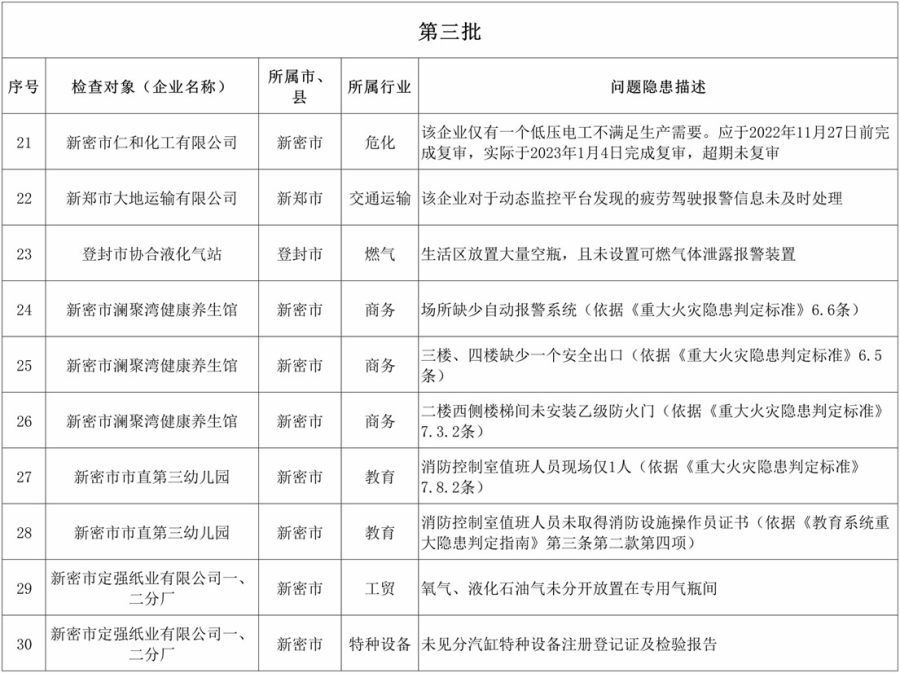 为扎实推进安全生产治本攻坚三年行动,压实企业安全生产主体责任,切实提高隐患排查整改质量,推动重大事故隐患动态清零,按照《河南省安全生产委员会关于开展全省第二轮安全生产明查暗访的通知》,2025年8月28日至9月9日,河南省安全生产明查暗访第一组对郑州市进行了明查暗访,现对明查暗访组发现的突出问题隐患予以集中曝光。各区县(市)、市直有关部门要高度重视,对问题隐患立行立改、依法查处,特别是对典型问题隐患要挂牌督办、追责问责、公开曝光、一案双罚;对问题隐患已整改到位的要持续跟进,防止问题反弹。要深入开展自查自纠,举一反三排查整治,彻底消除安全隐患,确保人民群众生命财产安全。