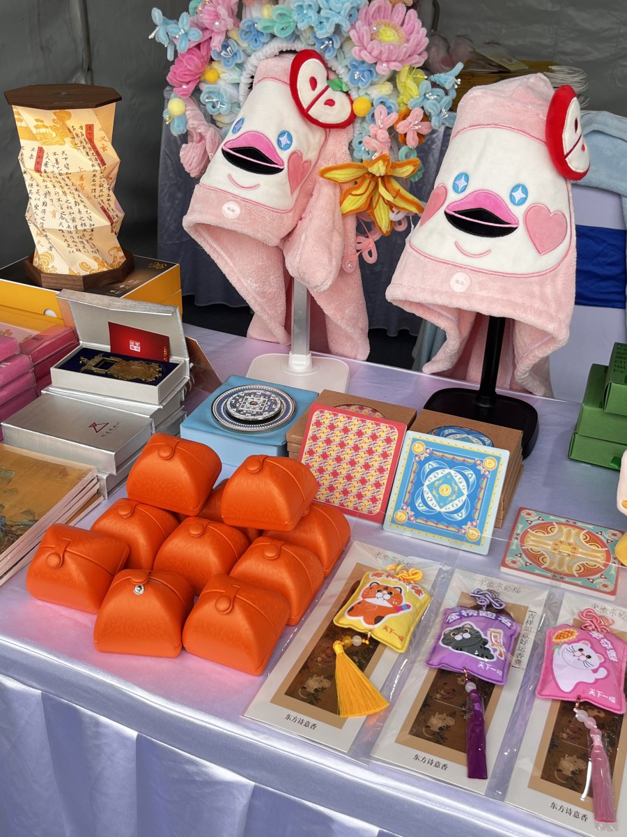 从“开封小笼包毛绒挂件”到“唐三彩抱鸭女俑瓶”,香包、挂件、精美书签应有尽有,作为此次赛事展示河南文化的窗口,河南嵩阳文化策划有限公司带着他们精心设计的文创产品来到颁奖台旁,为国内外游客带来独具匠心的游购体验。