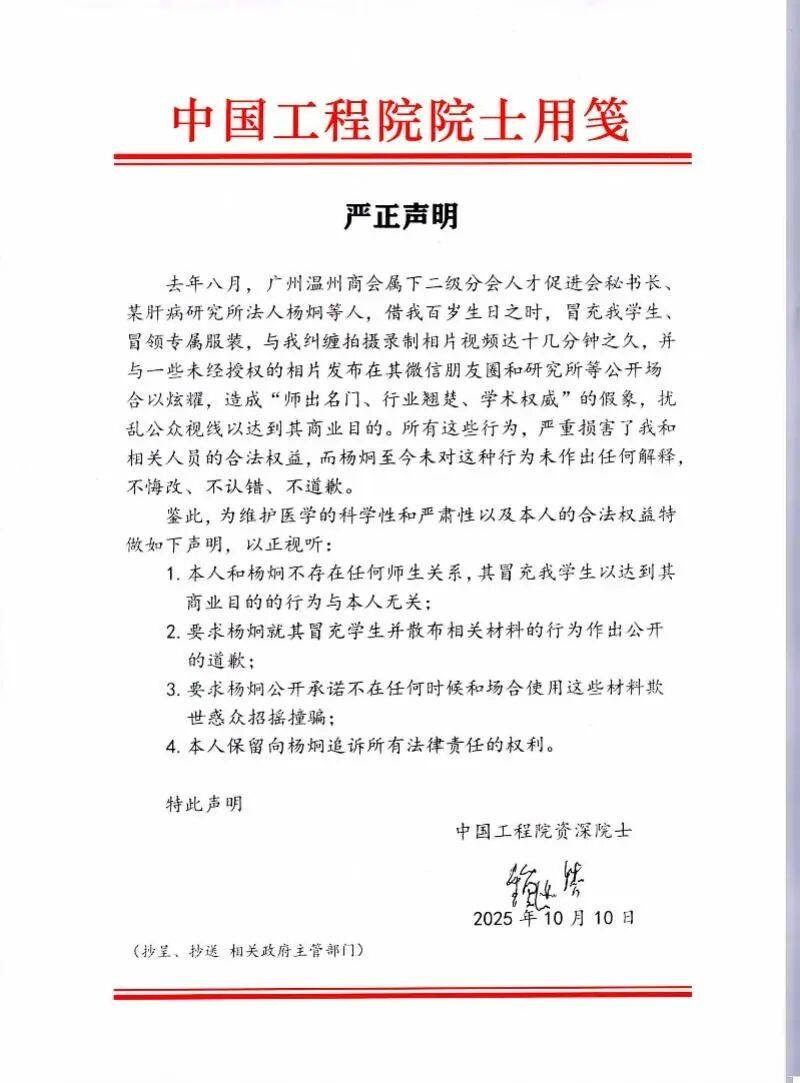我国解剖学泰斗、中国工程院院士、中国临床解剖学创始人、中国数字人和数字医学倡导者钟世镇院士办公室10月11日向南方都市报发来由百岁院士手书签字并委托发布的严正声明一份。