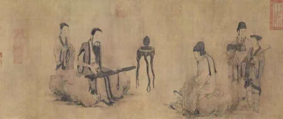 其时,科举制度已然停废,文人入仕无门,多隐逸山林,借琴棋书画维系文化身份,寄托孤高情怀。《伯牙鼓琴图》中,王振鹏借服饰的变化暗示对前朝文化的认同,伯牙着深衣、钟子期着道袍,元代盛行的“复古”思潮,得到了视觉化的呈现;“士”与“樵夫”的平等对话,暗含身份界限的跨越,既是向传统致敬,也反映出对知己的渴求。