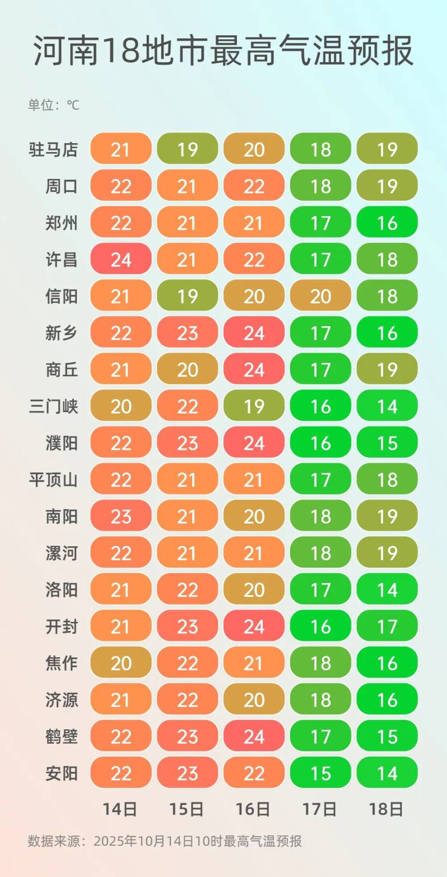 今起三天多地最高气温20度以上,暖意在线。随后受南下冷空气影响,17-20日全省自北向南先后出现大风降温天气,偏北风4级左右,阵风6到7级,气温较前期下降8到12℃,19日大部地区最低气温将跌至个位数,体感寒冷,21日早晨西部将出现初霜冻,建议大家关注气温预报,及时添衣,谨防着凉感冒。