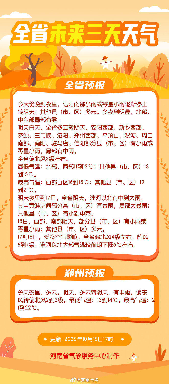 明天白天,安阳西部、新乡西部、济源、三门峡、洛阳、郑州西部、平顶山、漯河、周口南部、南阳、驻马店、信阳部分县(市、区)有小雨或零星小雨,局部有中雨。