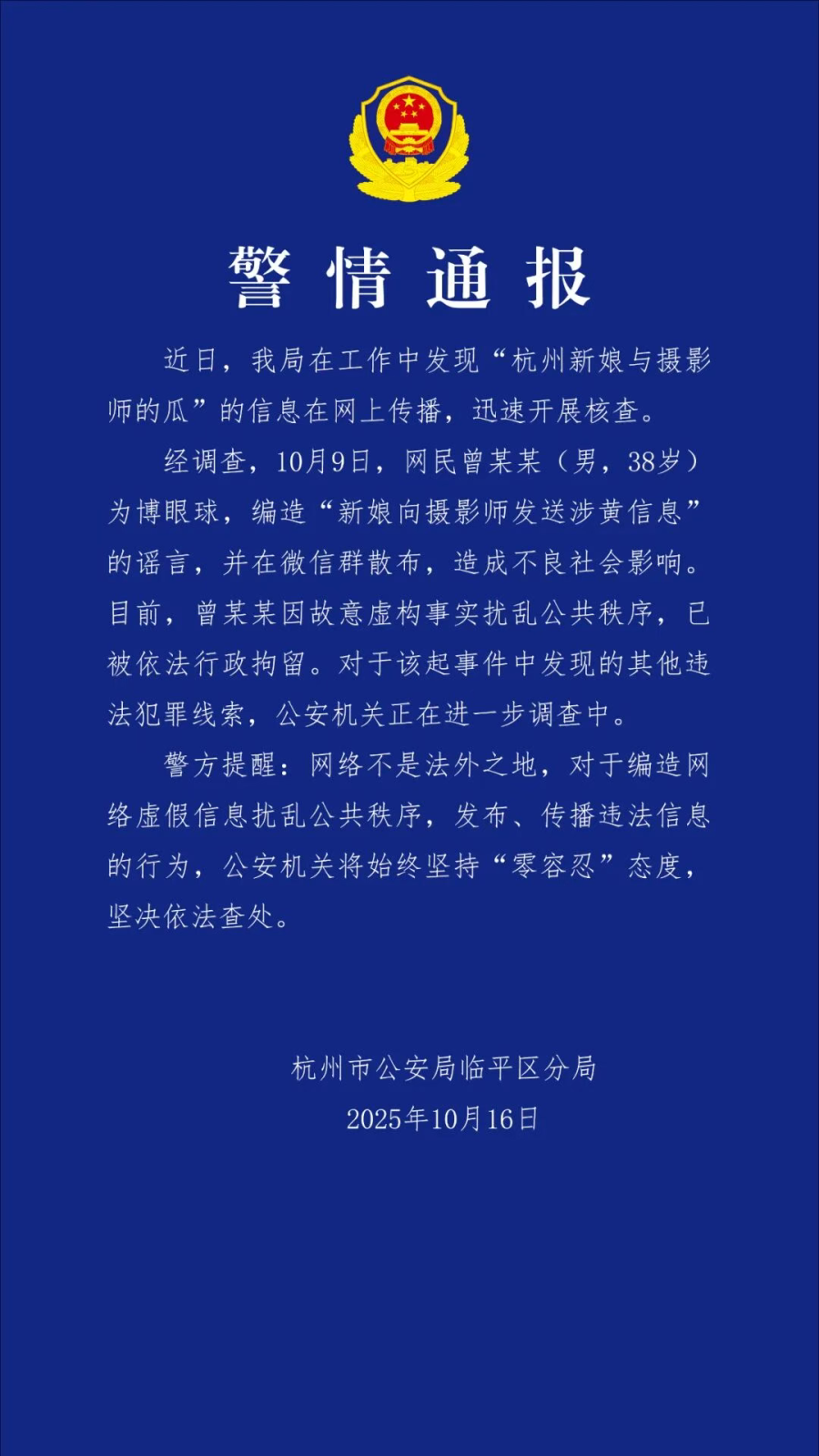经调查,10月9日,网民曾某某(男,38岁)为博眼球,编造“新娘向摄影师发送涉黄信息”的谣言,并在微信群散布,造成不良社会影响。目前,曾某某因故意虚构事实扰乱公共秩序,已被依法行政拘留。对于该起事件中发现的其他违法犯罪线索,公安机关正在进一步调查中。