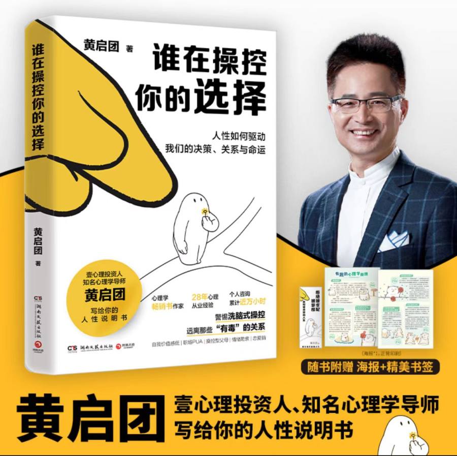 近日,壹心理投资人、知名心理学导师黄启团新作《谁在操控你的选择》与读者见面。这部聚焦人性与心理的力作,由湖南文艺出版社出版,甫一上市便掀起销售热潮,首发24小时实销突破1.2万册。