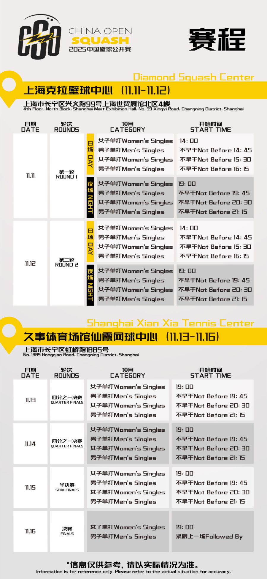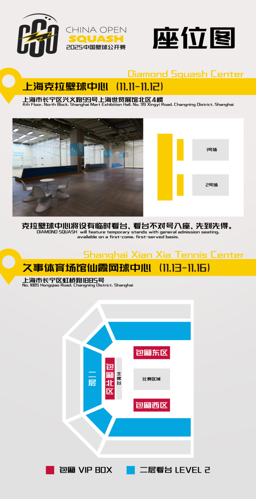 今年,中国壁球公开赛全面升级,由PSA世界职业巡回赛旗下的银级赛事跃升成为金级赛事,不仅赛程延长至6天,更创新采用“双主场”办赛模式,让现场观众能够大饱眼福。11月11日至12日的前两轮比赛将在上海克拉壁球中心展开,11月13日的四分之一比赛开始,赛事将来到久负盛名的久事体育场馆仙霞网球中心,以不同场馆的展示特性,来打造多层次、全景式观赛体验。