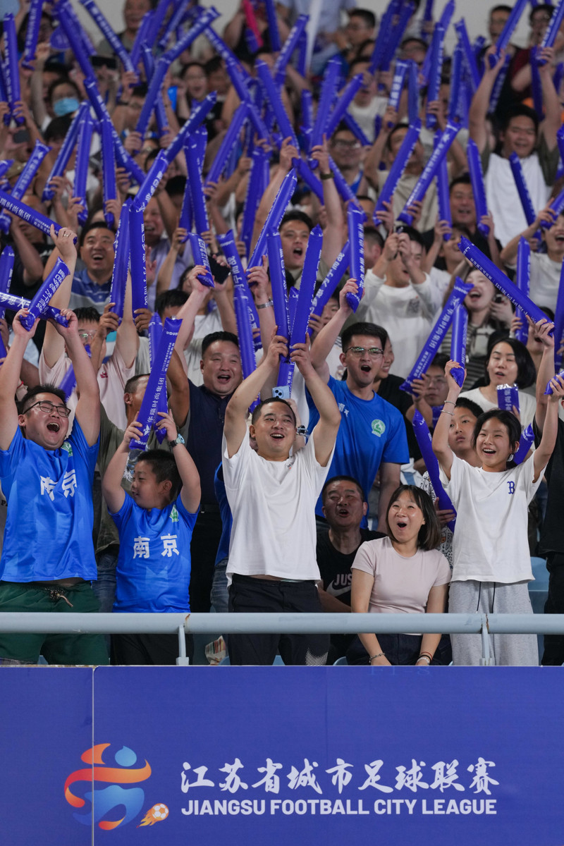 10月4日,球迷在现场为球员加油助威。当日,在江苏南京举行的2025江苏省城市足球联赛(“苏超”)四分之一决赛中,南京队主场与连云港队在常规时间1比1战平,通过点球大战,南京队以5比3的总比分战胜连云港队,晋级半决赛。 新华社记者 李博 摄