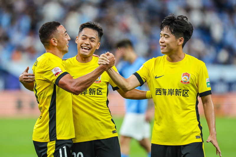 9月28日,青岛西海岸队球员戴维森(左一)在比赛中与队友庆祝进球。当日,在广东深圳举行的2025赛季中国足球超级联赛第26轮比赛中,青岛西海岸队客场2比1战胜深圳新鹏城队。 新华社发(彭志刚 摄)
