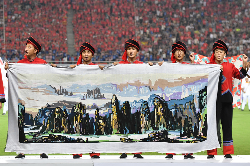 新华社照片,长沙,2025年9月7日,张家界队在开幕式上。今年9月至12月,湖南14个市州组队出征“湘超”,周五、周六、周日为比赛日。13轮单循环制常规赛后,前八名进入淘汰赛并最终决出冠军。 新华社记者 陈振海 摄