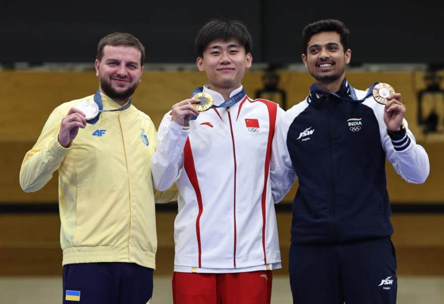 2024年8月1日,冠军中国选手刘宇坤(中)、亚军乌克兰选手库利什(左)和季军印度选手库萨莱在颁奖仪式上。当日,在法国沙托鲁举行的巴黎奥运会射击男子50米步枪三姿决赛中,中国选手刘宇坤夺得冠军。 新华社记者 张帆 摄