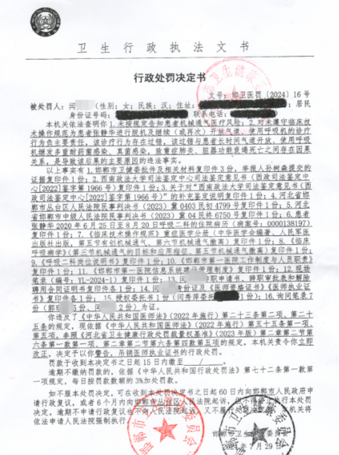 2024年7月29日,邯郸市卫生健康委员会作出行政处罚决定书,因呼吸二科主治医师闫某萍、呼吸二科主任郭某霞违反了《中华人民共和国医师法》的规定,责令闫某萍、郭某霞立即改正,吊销医师执业证书。
